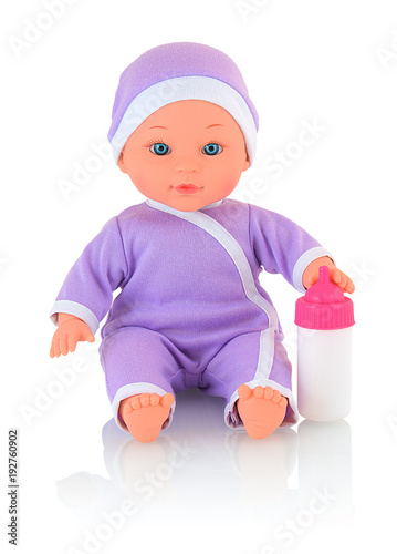 Baby Doll Wearing Bodysuit And Cap With Bottle Of Milk Isolated